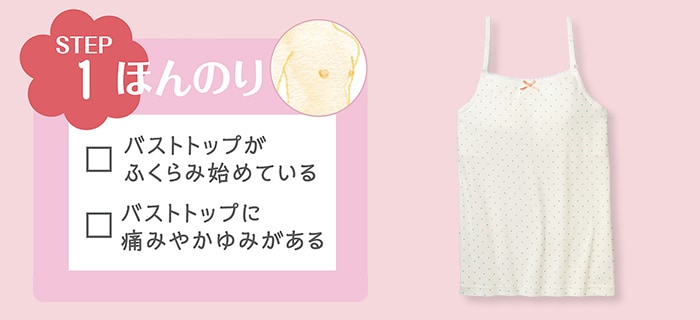 胸の成長は、バストトップからはじまります。乳頭の周りがふくらんで、Tシャツの上からバストトップがわかるようになったり、インナーや服で擦れるとチクチクとかゆみ・痛みを感じたりすることも。お子さんが胸を気にするようなしぐさがあれば、それが胸の成長のサインとして受け取ってあげましょう。ブラを着けはじめる時期は子供それぞれ。年齢や身長にかかわらず、お子さまのサインを見逃さないようにしてあげたいですね。