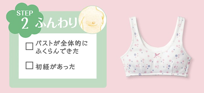 バスト全体がふくらみはじめると、胸のサイズはぐんぐん変わっていきます。その時々に合ったサイズのブラを着けさせてあげたいですね。バストの形にフィットして伸縮する、成長を妨げないタイプを選んであげましょう。