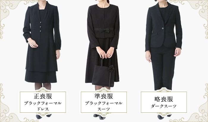 もし喪服の準備が無い場合やお通夜であれば、女性は黒いワンピースやセットアップ、黒スーツなどを着用します。正喪服と違って、多少の飾りなども派手にならない程度であればかまわないとされています。
