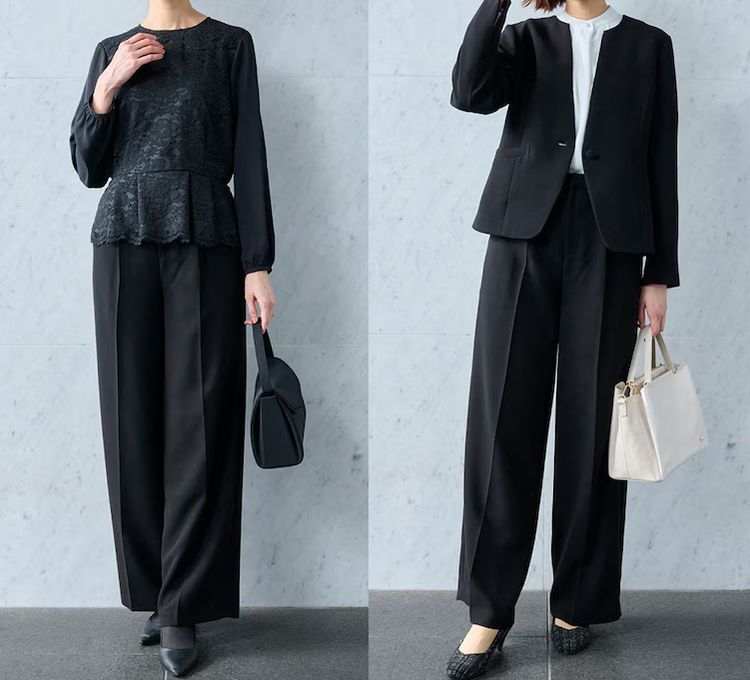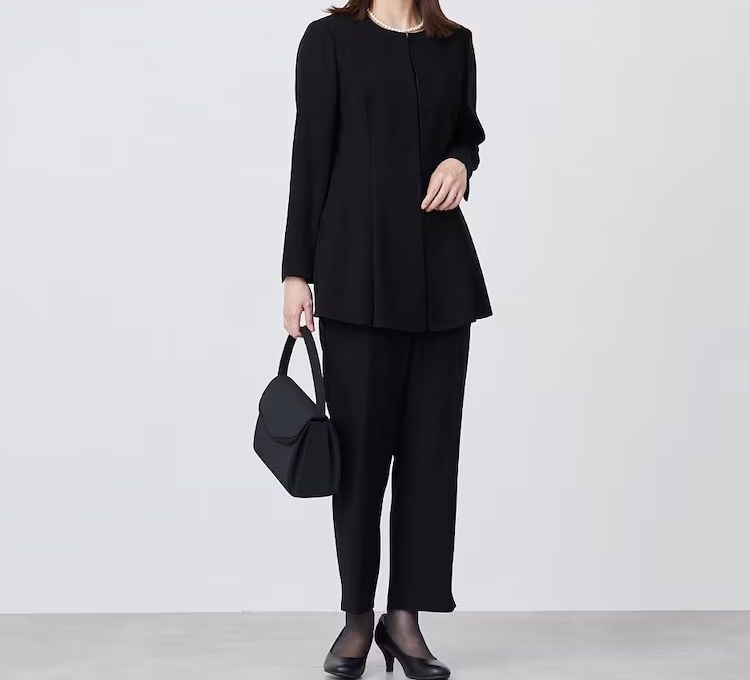 お通夜やお葬式に参列する機会が増えていく世代ですから、きちんとしたブラックフォーマルを1着は持っておきたいですね。体型が気になる方は、体のラインをカバーするワイドパンツやワンピースタイプのブラックフォーマルがおすすめ。