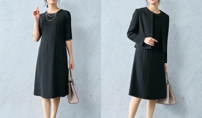 喪服のワンピースなどに合うフォーマルジャケットをプラスして、カラーフォーマルな印象にチェンジ。グレーやベージュなどの色を選べば、ハレの日に相応しい装いになります。