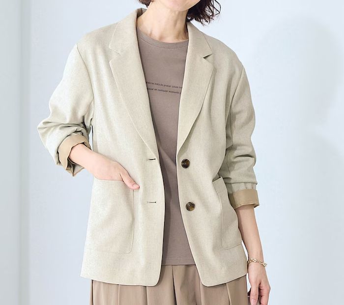 ジャケットはリネン混や淡い色を選ぶと重くならず、ノーカラーならよりソフトな印象になります。知的な雰囲気を出すなら、パンツスーツと好相性なステンカラーコートもおすすめです。