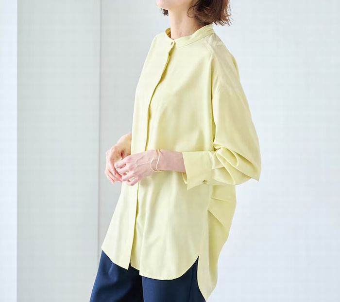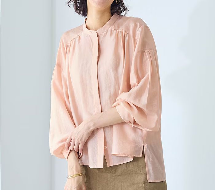 春のトップスで活躍するのはブラウスです。一枚で着映えするデザインを選ぶと、ジャケットを脱いだ時も様になります。
