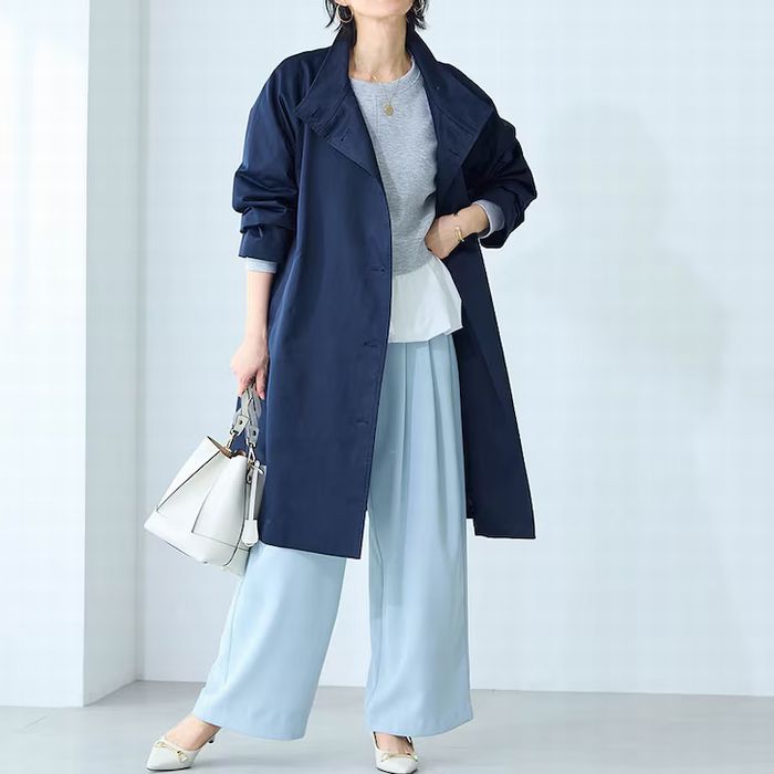 薄手で軽やかな「ライトアウター」は、気温差のある春の通勤に欠かせないアイテムです。ベージュやネイビー、カーキなどのトレンチコートは王道かつ万能で、とろみ素材なら女性らしさも加わります。