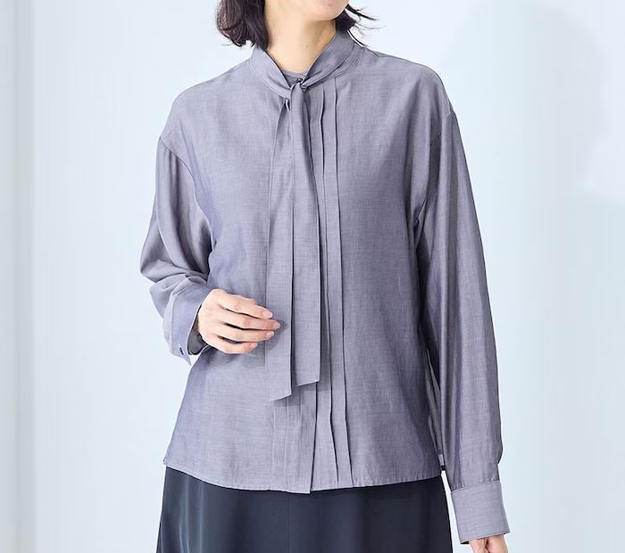 首元にデザインのある「ボウタイブラウス」や、胸元にギャザーが寄せられたデザインだと洗練された印象になります。袖口にパールがあしらわれたり、パフスリーブになっていたりと、ディテールに凝ったものを選ぶと、アクセサリーをつけなくとも上品な華やかさが演出できるでしょう。