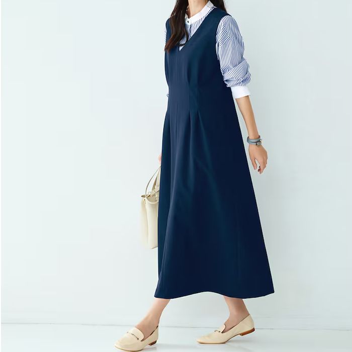 近年、オフィスカジュアルのトレンドアイテムとして浮上しているのがきれいめ素材のジャンパースカートです。深めのVネックやタイトなシルエット、黒、ネイビー、チャコールグレーなどの落ち着いた色味を選ぶことで、大人の女性らしい洗練されたスタイルになります。