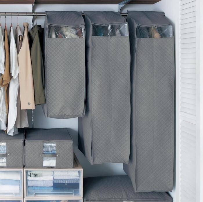収納スペースによってはハンガー収納が難しい場合もあると思います。その場合はふんわり畳むイメージで収納ケースに保管します。ぎゅうぎゅうに詰めてしまうとシワになってしまいますので、できるだけ収納する衣類の数を減らしてスペースを確保してください。