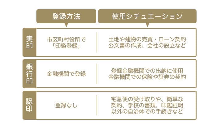 印鑑の種類を大きく分けると、「実印」「銀行印」「認印」の3つに分類されます。それぞれ簡単に説明すると、実印は重要な契約、銀行印は金融機関との取引、認印は宅急便の受け取りなどに使われます。