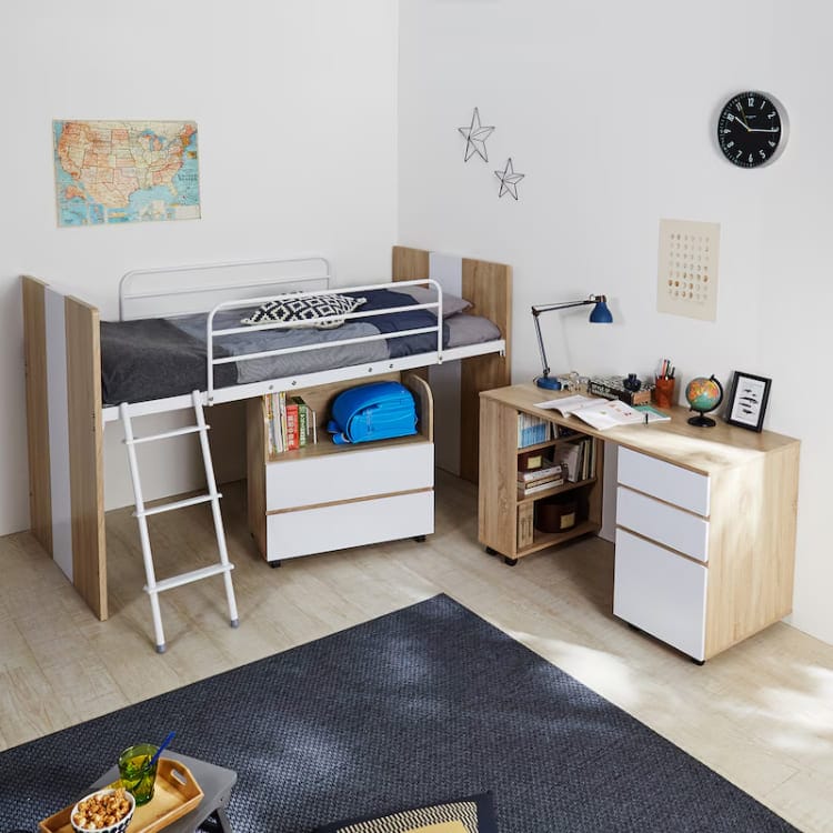 このタイプは、ベッド部分が高い位置に設置されており、はしごや階段で上り下りするベッドです。ベッド下のスペースには、デスクや収納棚、ハンガーラックなどが置けます。ただし、ロフトタイプのベッドは大きいため、部屋に圧迫感が出やすくなります。フレームの色を壁の色に近い白や明るい木目にしたり、照明を工夫して奥行きを出したりすると、圧迫感を抑えておしゃれにできます。
