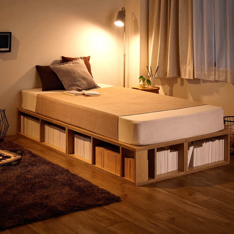 ライフスタイルに合わせたベッドもおすすめ。こちらは、4タイプのユニット収納を組合せてベッドに出来る驚きの形。お気に入りの本を並べたり自由にカスタマイズ出来て、すっきりした収納はもちろん、寝る前の幸せな読書タイムが叶います。