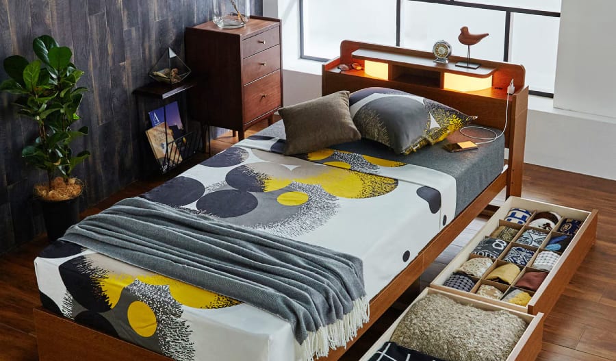 ベッドの下やヘッドボード部分に、引き出しやキャビネットなどの収納スペースを備えているベッドです。クローゼット以外の保管場所としても活用でき、家の収納が足りなくても限られたスペースを有効に使えます。