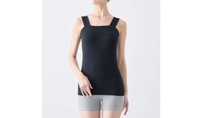 肌あたりがやさしい脇に縫い目がない筒編み設計や、消臭機能のある特殊なコットンをブレンドしているので、汗をかいてもべたべたせずに快適に過ごせます。肩紐が調整できるのもうれしいポイントです。