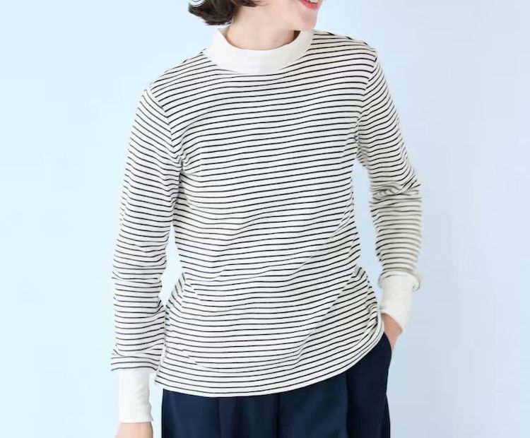 首元のハイネックデザインは、冷気の侵入を防ぎつつ、適度な伸縮性を持ちながらも締め付け感もありません。綿の持つ吸湿性と通気性で、たくさん着こまなくても、あたたかく快適に過ごせます。