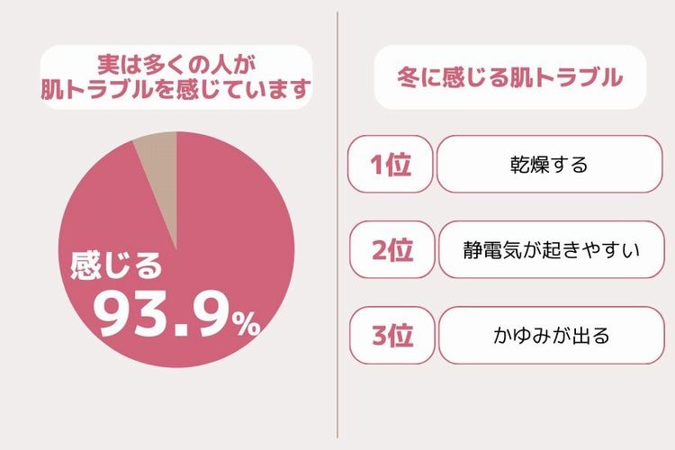 冬は乾燥によって肌のバリア機能が低下しやすく、肌トラブルが起きやすい季節。上記画像のデータから分かる通り、多くの方が冬にさまざまな肌トラブルを経験しています。
