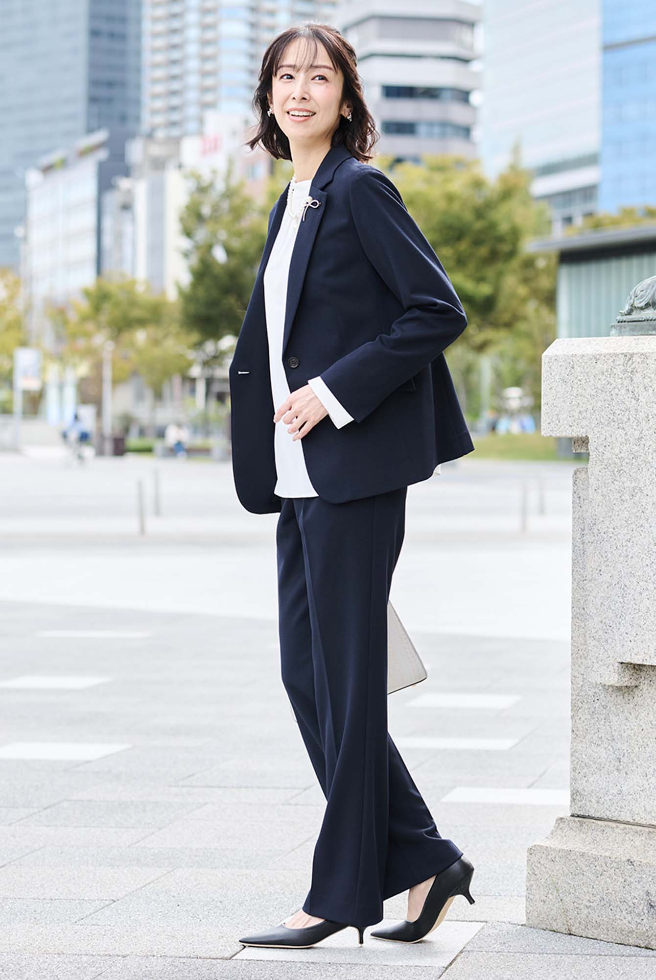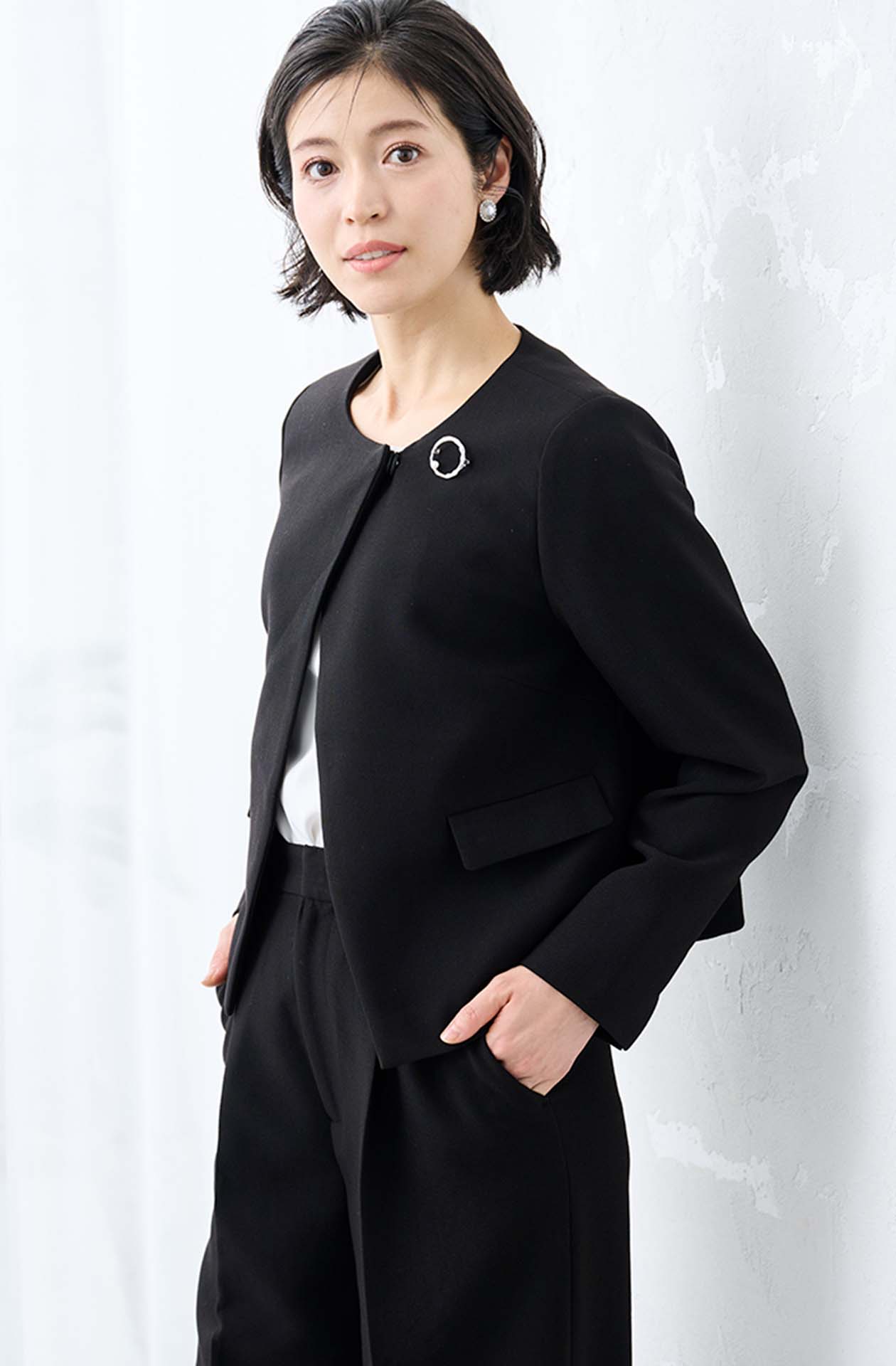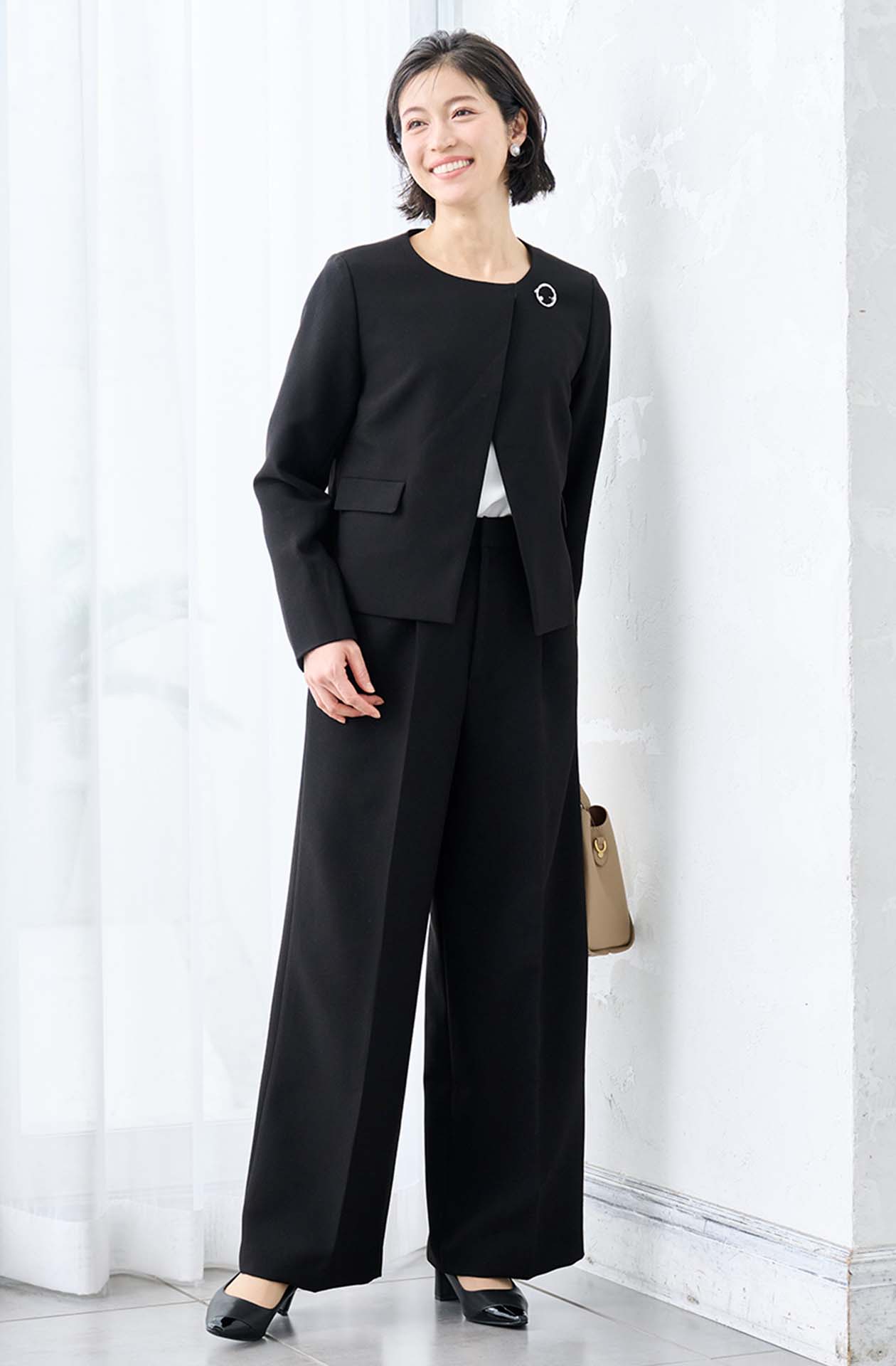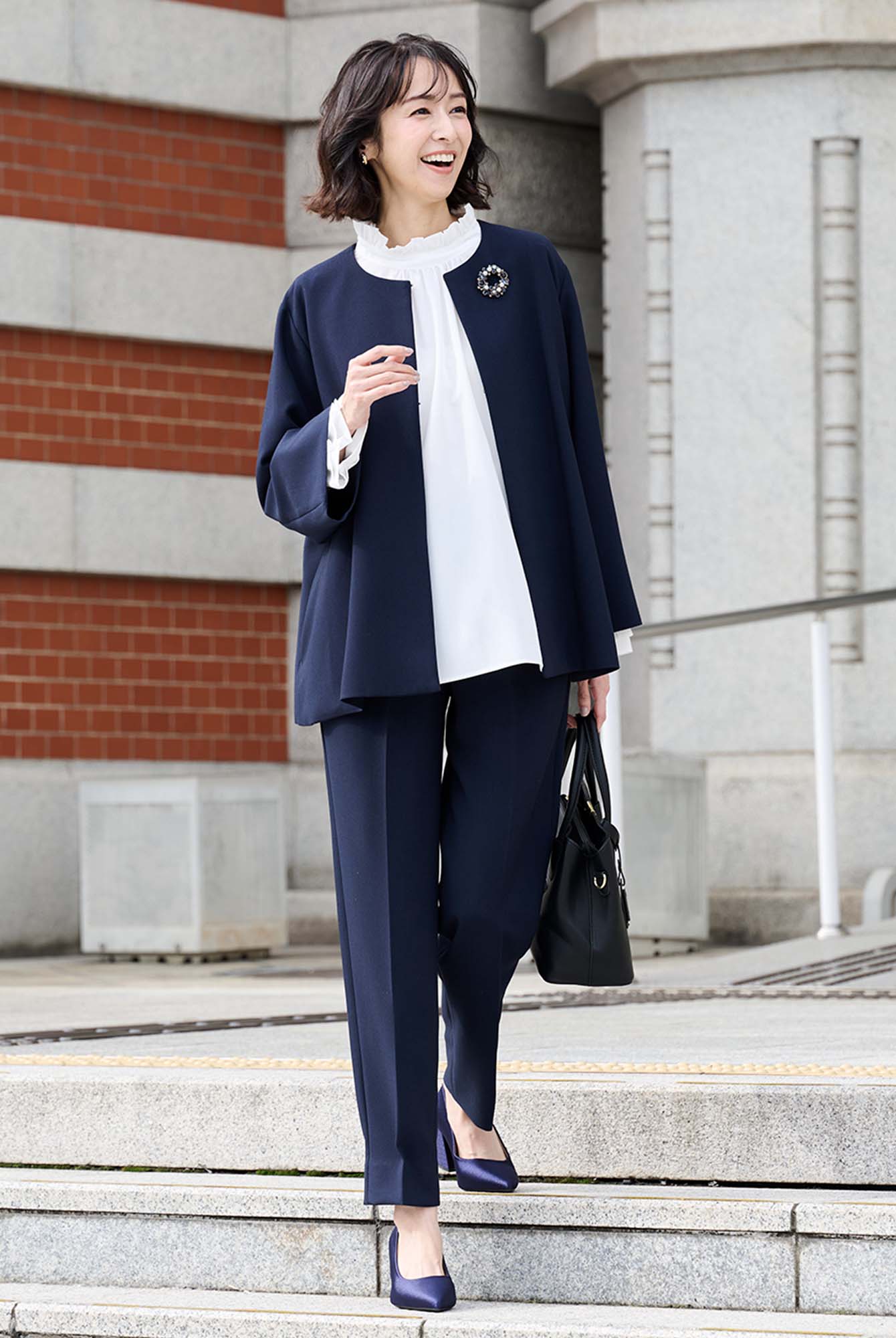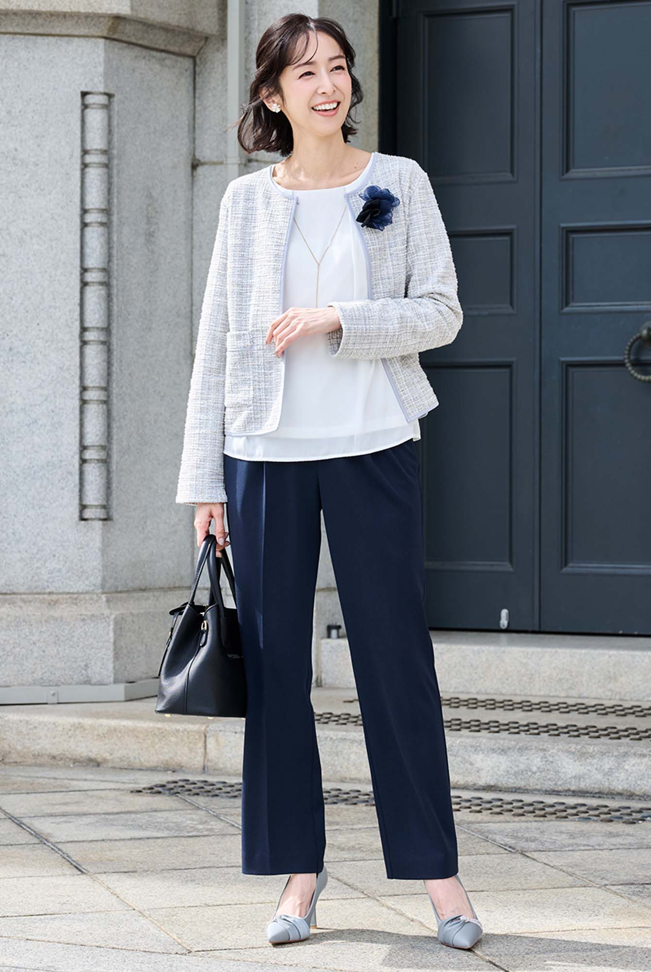 ブラウスなしで日常使いしやすい ジャケット+パンツの2点セットも!