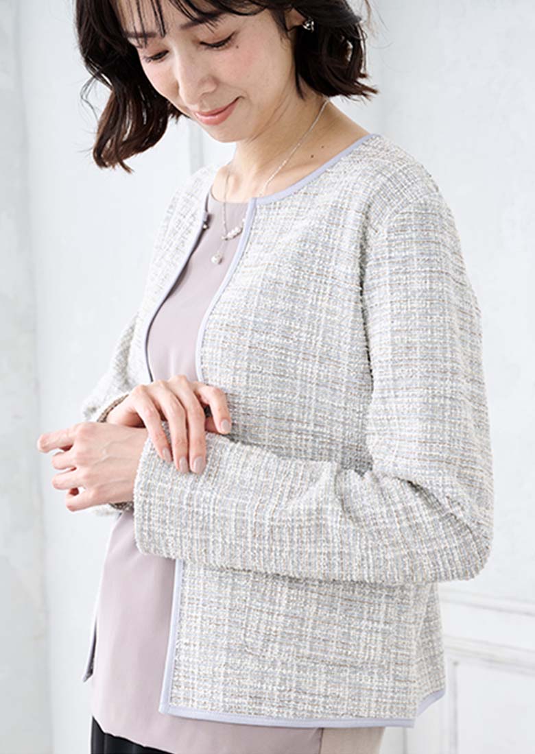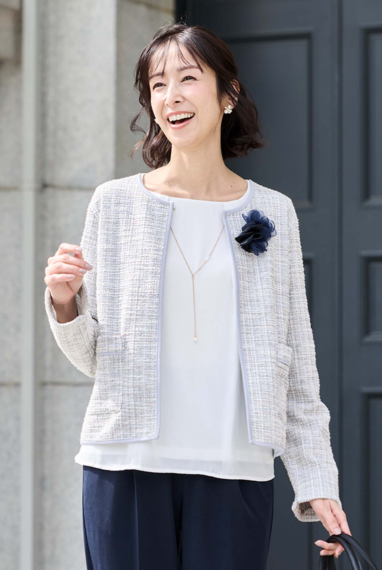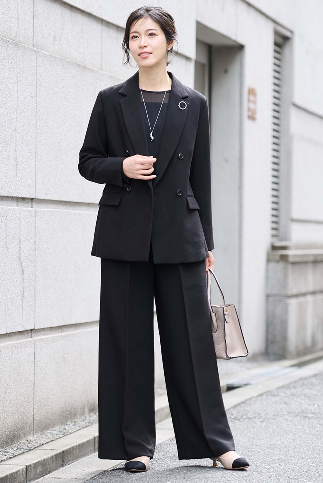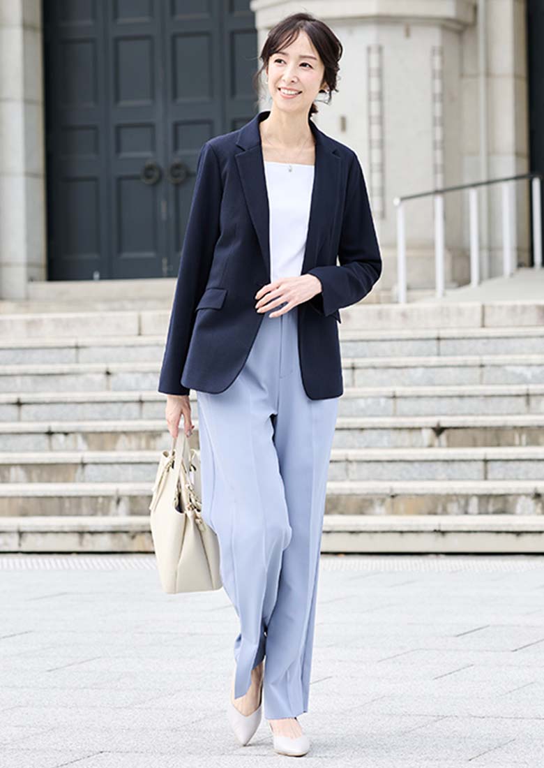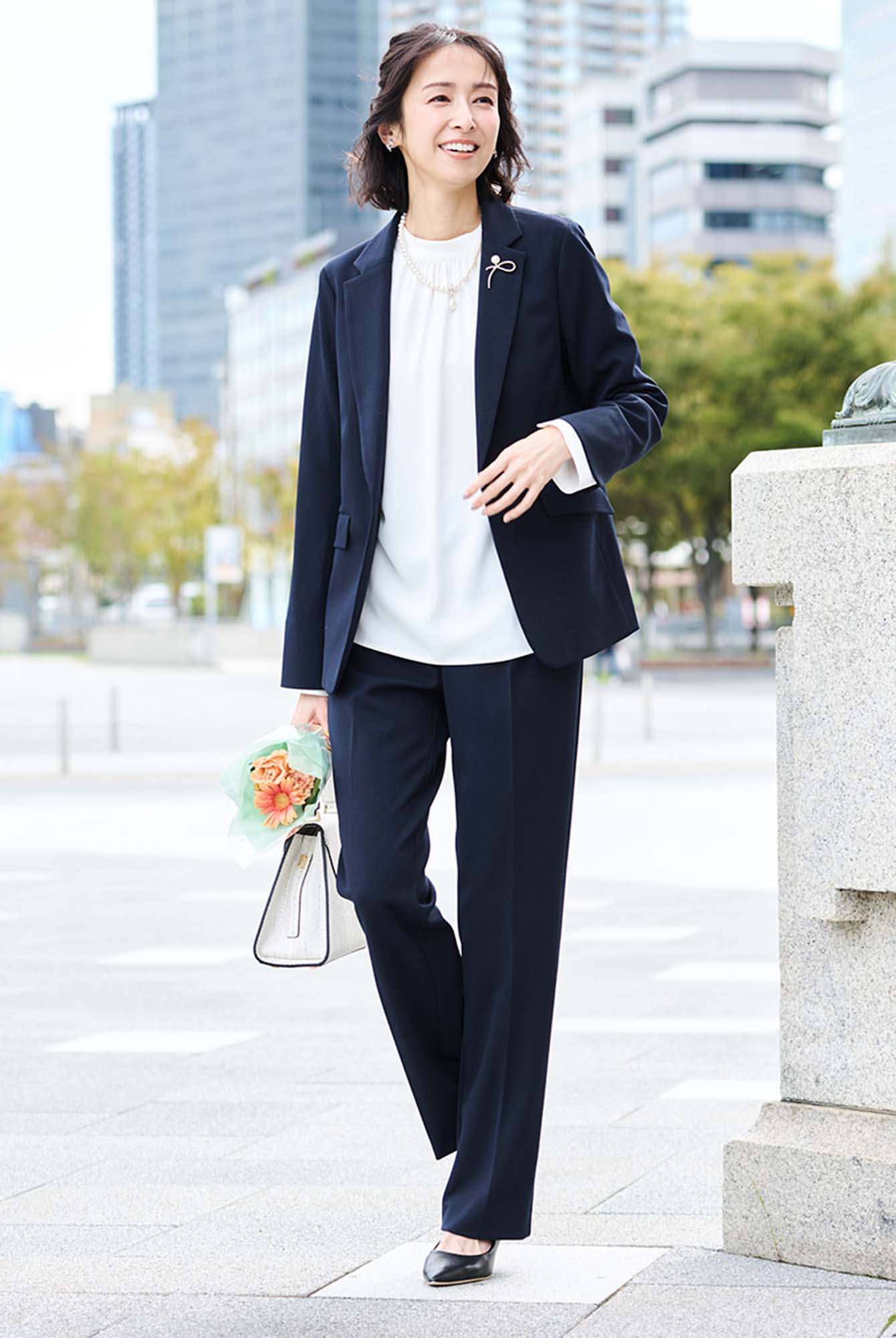 ブラウスなしで日常使いしやすい ジャケット+パンツの2点セットも!
