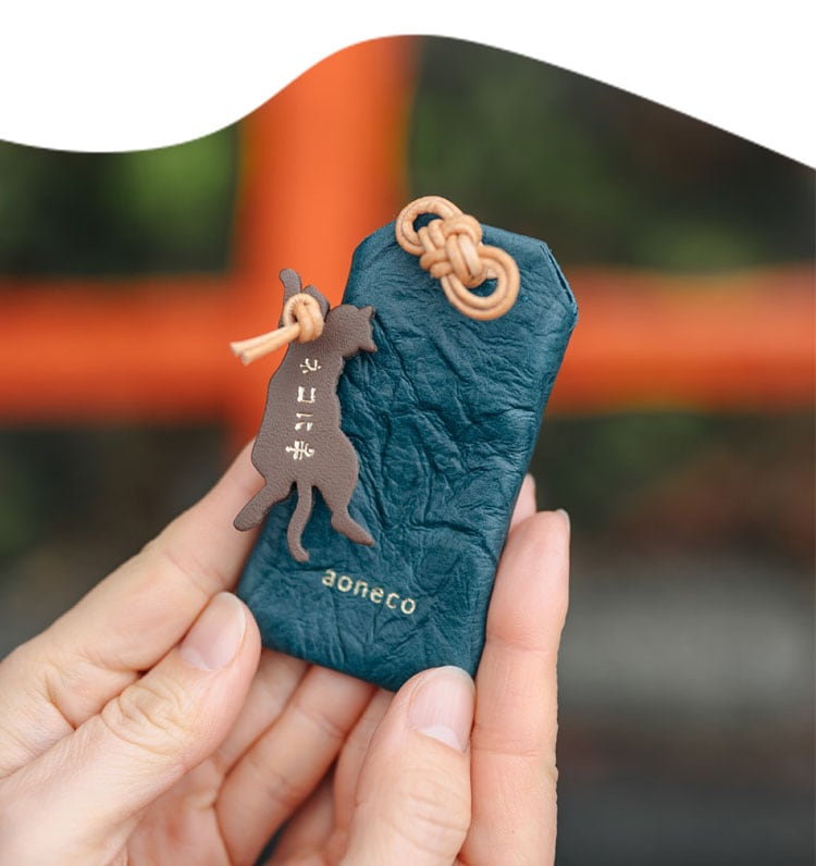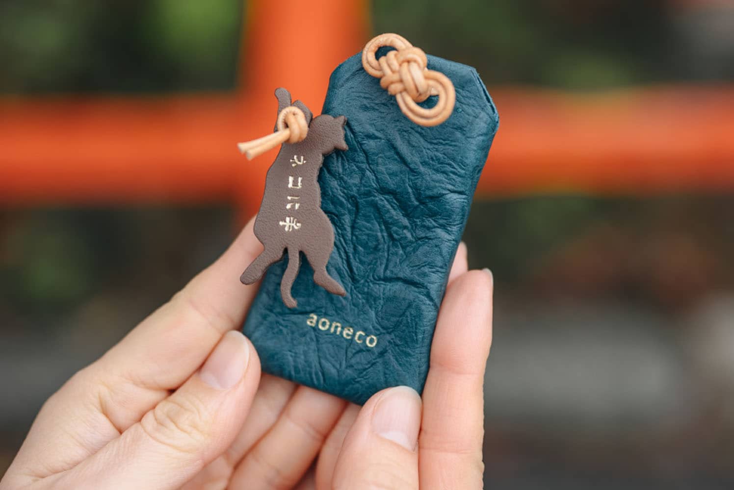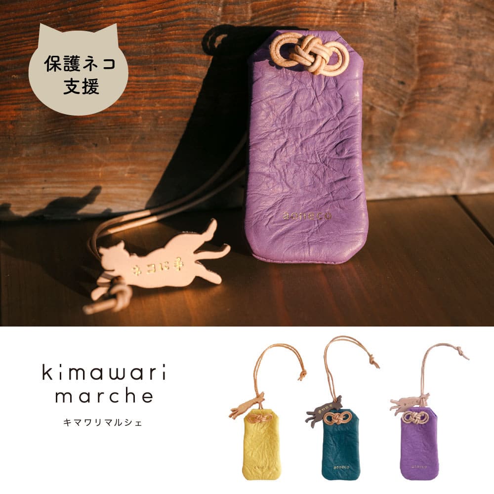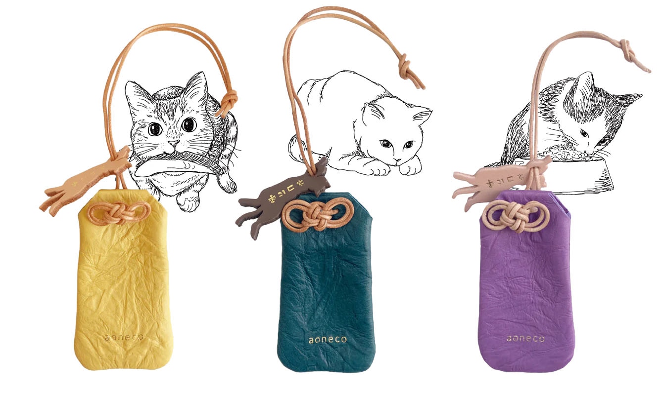 環境に配慮した革で作られた御守りは能登半島のネコの支援をきっかけに誕生。中に大切なネコの毛やヒゲを忍ばせて使うこともできます。