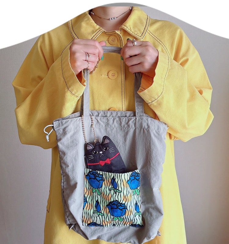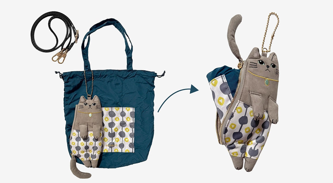 中にトートバッグが入っている実用性を兼ね備えたポーチ型のぬいぐるみ。付属のショルダーが付いているので、サコッシュとしてもお出掛けにぴったりです。