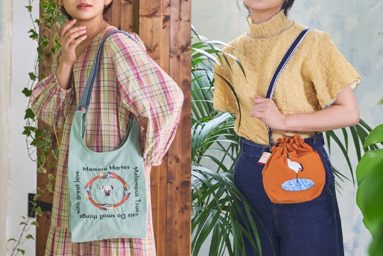 絶滅の恐れがある動物がデザインされたバッグと巾着ポーチの第2弾が登場。彩り豊かな立体感あふれる刺繍と生地のコントラストも楽しめる逸品です。