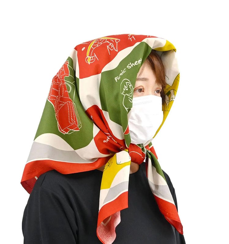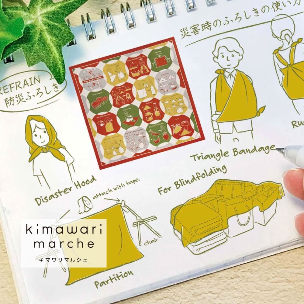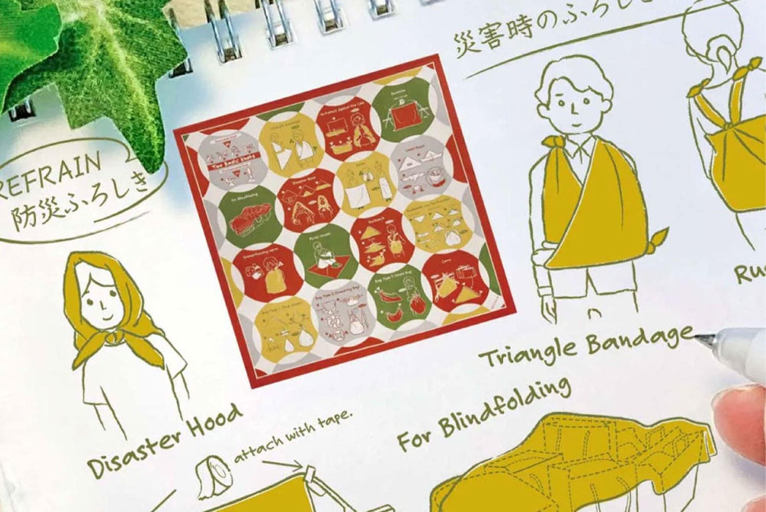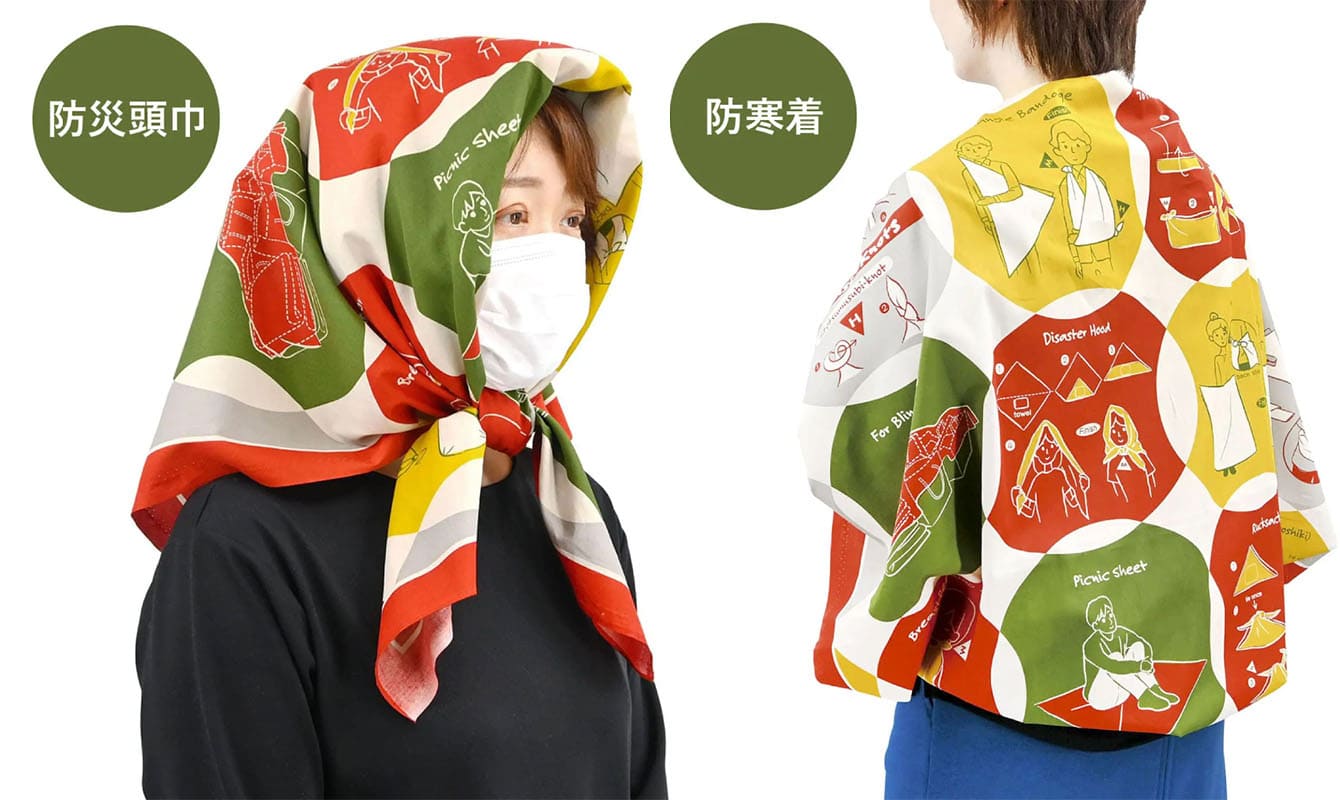 コンパクトなふろしきが防災頭巾や防寒着、三角巾など多様に変化。防災バッグに入れておくと、いざという時に役立ちます。