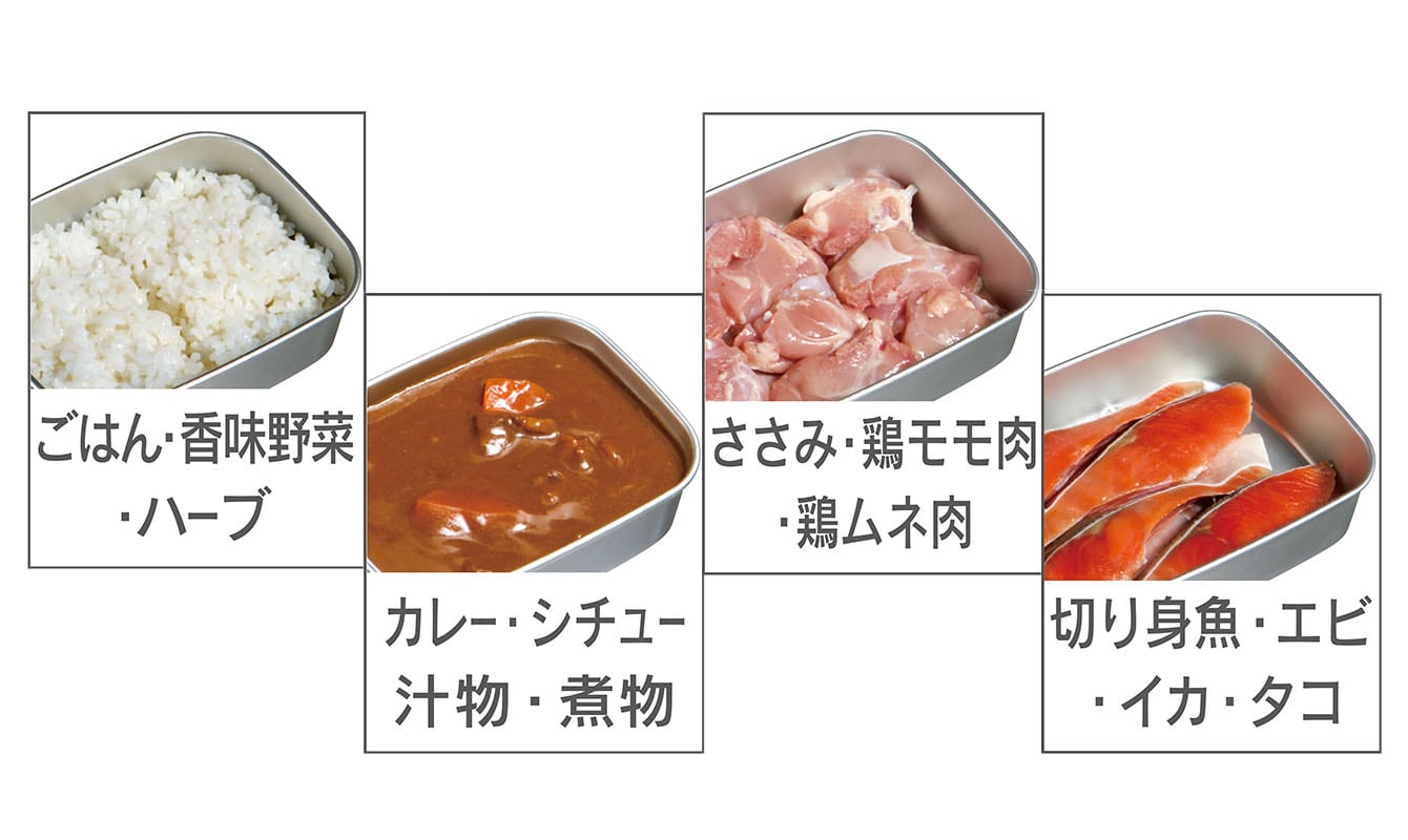 アルミ素材の冷却スピードが食品の細胞を守り、おいしさを閉じ込めて急速冷凍。ごはんやカレー、肉や魚、野菜の旨味や栄養分を逃がしません。