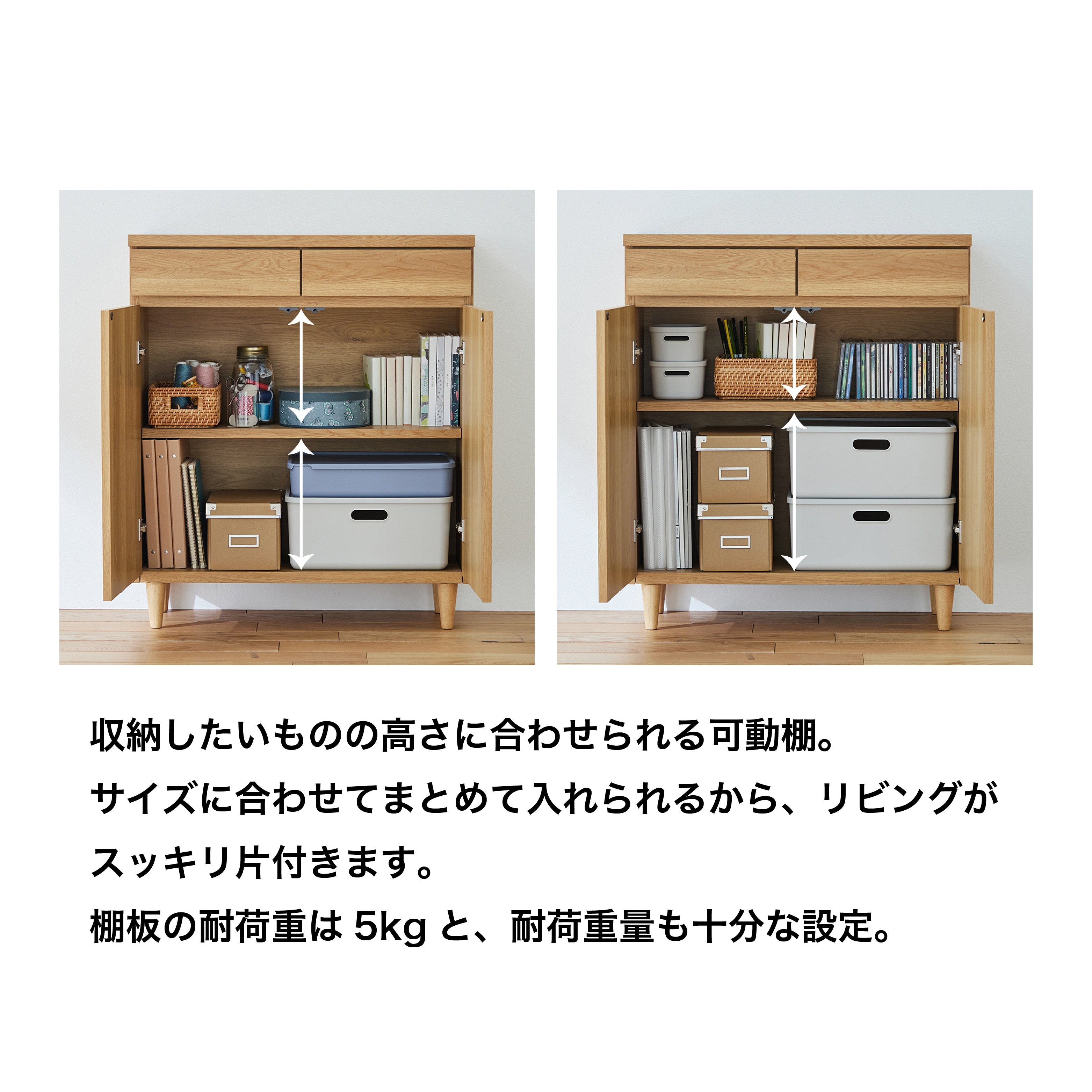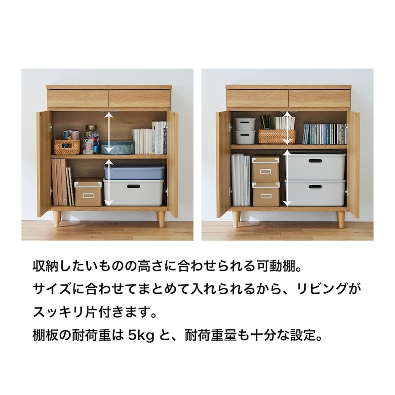 ドキドキしてましたが実際のお品も安っぽくなくて、サンプル通り色合いも良かったです。 設置を依頼したので楽チンでした。置いた後も、扉の少しのズレや扉の開閉具合を見てくれてササッと直してくれたり、引き出しも開閉チェックしてくれてちょっとのガタつきも直してくれて、ありがたかったです。 棚板を受け止めるやつも金属製。差し込むだけのタイプでは無く、ネジ式になっていて、受ける側も金属製の穴になっていて、この仕様は嬉しかったです。 無印のファイルボックスワイド(グレー)の丸い穴が手前に来るように並べると、左側(両開き)は上4個下4個、右側(片開き)は上2個下2個がぴったり入りました。 住宅関連のファイルや取説ファイル、カタログ類、雑誌などを収納しました。 主人も「これいいね」と言ってましたので、良い買い物が出来たと思います。