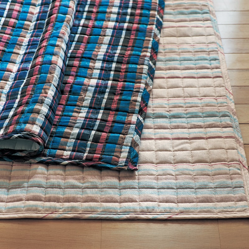 去年ベージュのチェック柄購入。今年はネイビーチェック購入。我が家は床座りにちゃぶ台スタイルなので厚みはレギュラーで。小さな子供がよく食べこぼすので洗濯回数多めですが、洗濯した後にいい味わいになるのが気に入って2枚目購入しました。真冬は使用していませんが、暑い時期はさらに素足の肌触りが最高です!