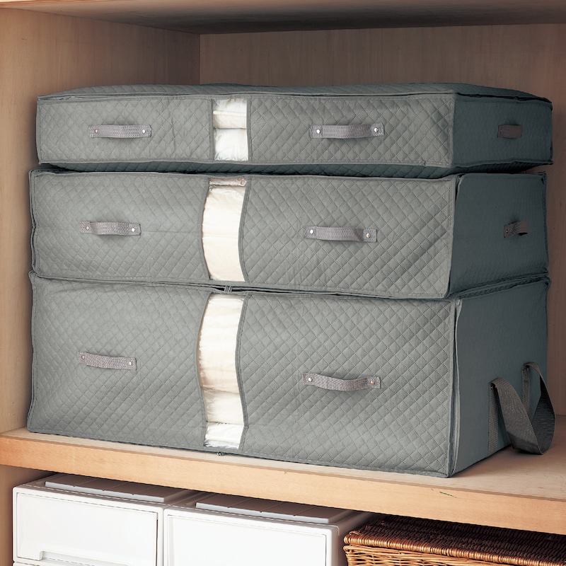 以前は真空の圧縮袋にしまっていましたが、重なると取り出しづらく、何度も使用するとチャックが上手く出来なくなり困っていました。