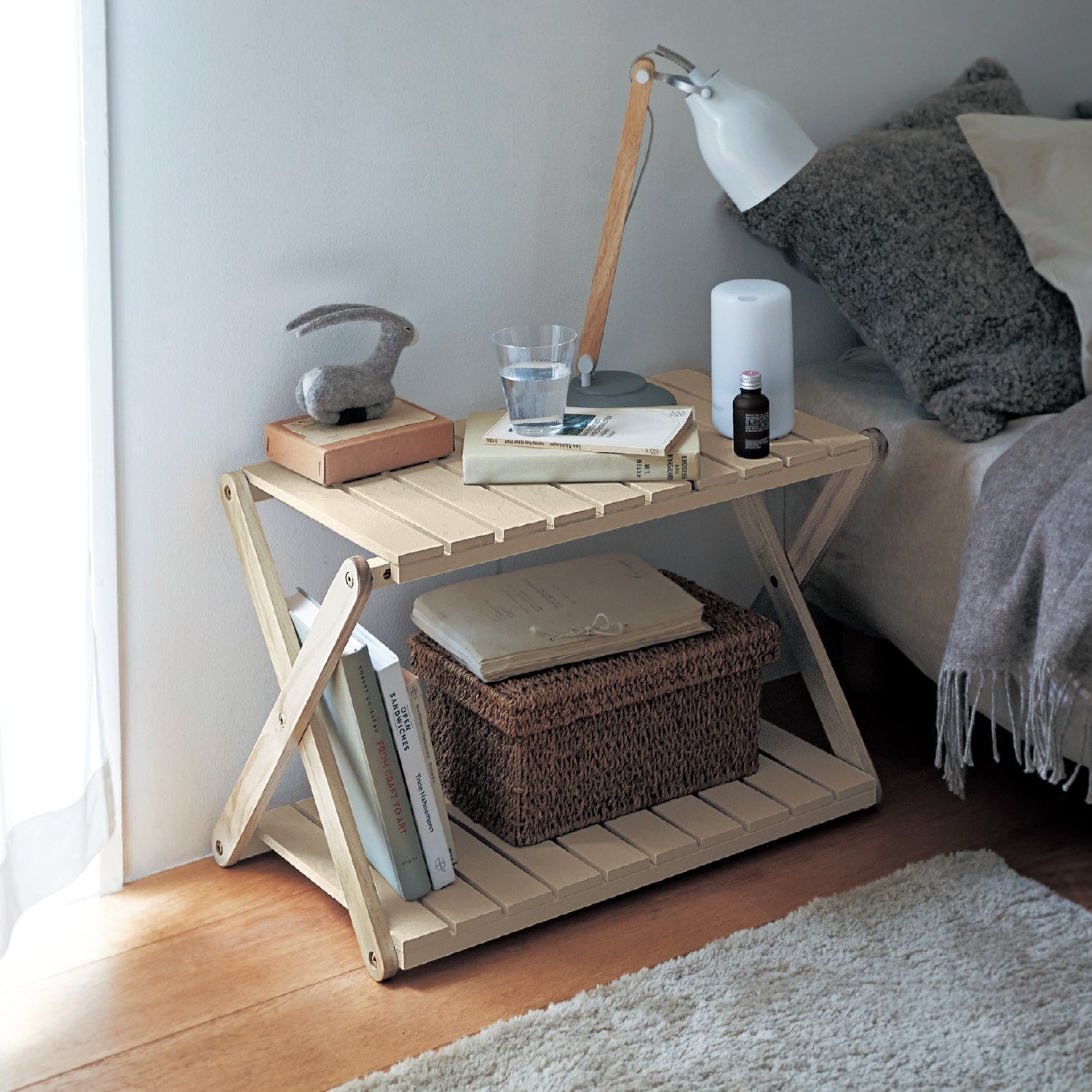 ベット横に置いてスマホ充電や時計を置くのにとても便利です。