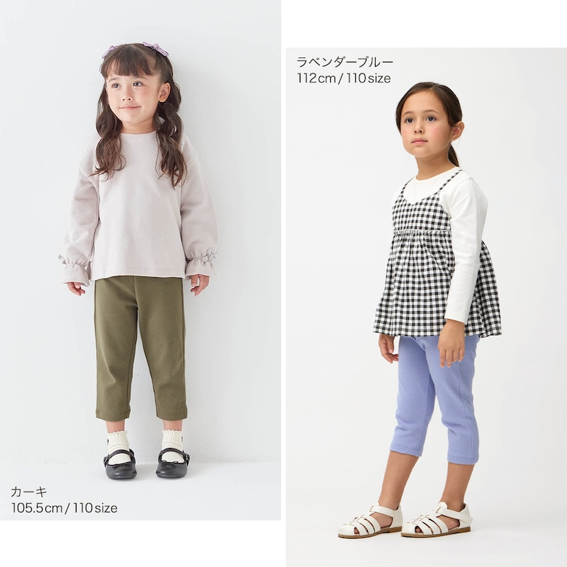 身長82センチ 体重14キロ という小さくてぽっちゃりな2歳7ヶ月の娘にサイズ100と110を。 保育園で自分でお着替えするのに「お母さん、もっとゆったり伸びる服にしてください」と言われ、パジャマみたいに着やすい服を探していました。 この7分丈の大き目サイズを長ズボンとしてはかせてみたら「これなら自分でお着替えしやすいようです」と保育士さんに言われ一安心。たくさん買い足しました。 “ハンカチが入るポケット付き七分丈レギンスパンツ”とすごく似てますが、こちらが厚手です。 真冬は寒く、真夏には暑そうな厚さですが、それ以外は長く着られそうです。 しっかりした生地ですが、内ポケットがないので部屋干しでも1日で乾きます。