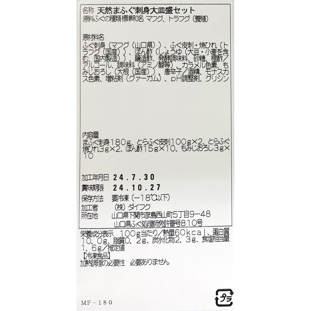 ●まふぐ刺身180g(36cmプラ皿)、とらふぐ皮刺100g×2、とらふぐ焼ひれ3g×2、ぽん酢15g×10、もみじおろし3g×10