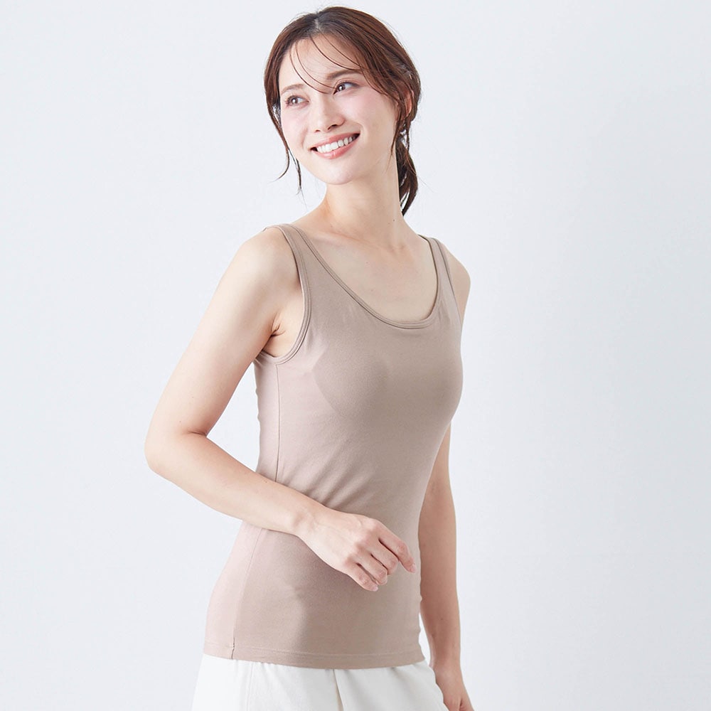 締め付けないとあるので、緩いのかなと思っていたら、冷やしさらっとリブキャミソールと比べると、こちらの方がぴったりめです。自分のトルソーの形がはっきり出るので、一枚で着るには注意・覚悟が必要です。綿混で生地がしっかりした感じで、着心地はとても良いです。ただ、真夏には暑いかも。色合いは、杢ラベンダーというより薄くて、ベージュに近い印象です。写真ではもう少しピンク味が濃く見えました。
