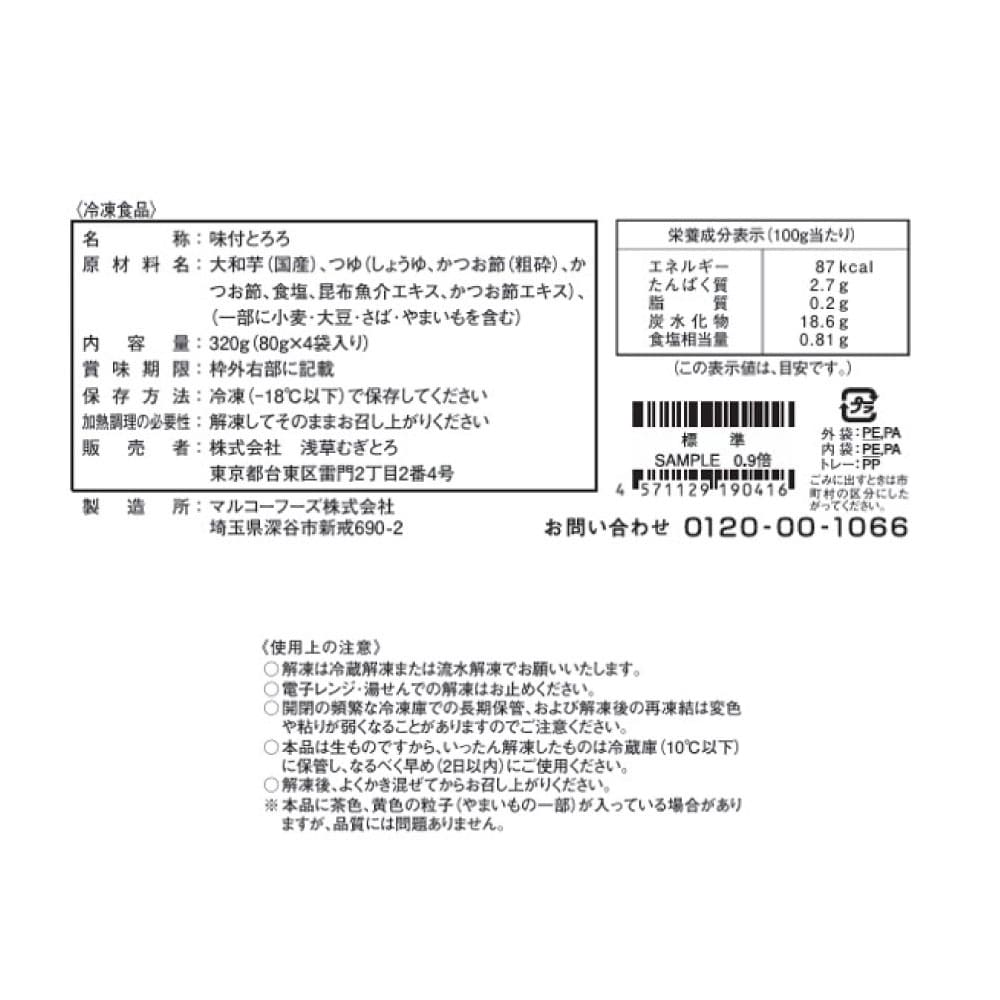 昭和4年から受け継がれた「浅草むぎとろ」秘伝の出汁を粘りの強い国産大和芋に合わせました。かつお出汁の効いた味付とろろがご飯に良く合います。一人前ずつ個包装になっており、流水で簡単に解凍できるので、食べたいときに食べられます。お店の味をそのままにご家庭でお楽しみください。