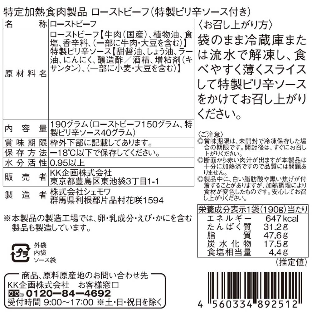 解凍し、カットするだけでしっとりとした味わいのローストビーフとうま辛のおいしさが味わえます。