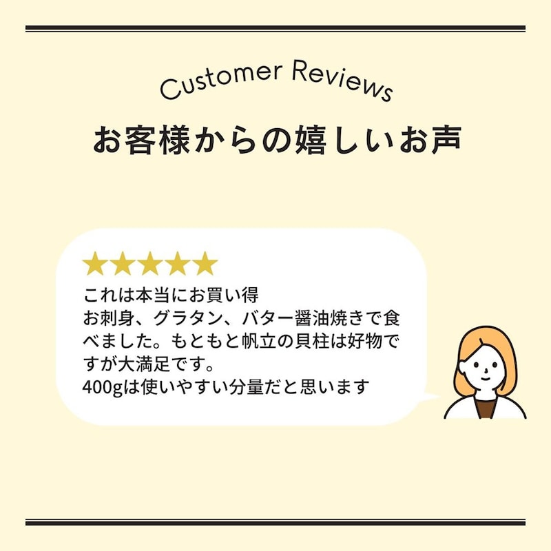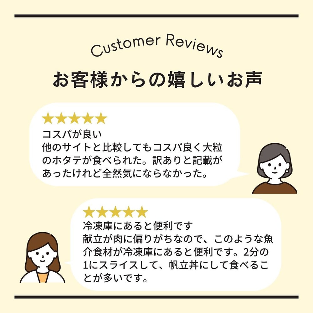 とても、大ぶりのホタテで、感激しました。家はフライとバター焼きが、大好きで、これから、調理するのが、楽しみです。期待ハズレが結構あったのですが、この商品はとても満足してます。購入成功ですね。