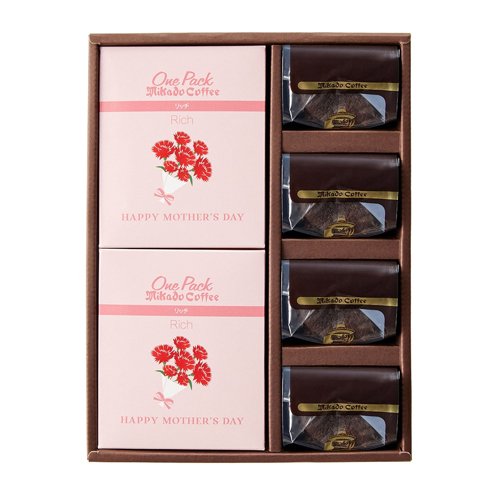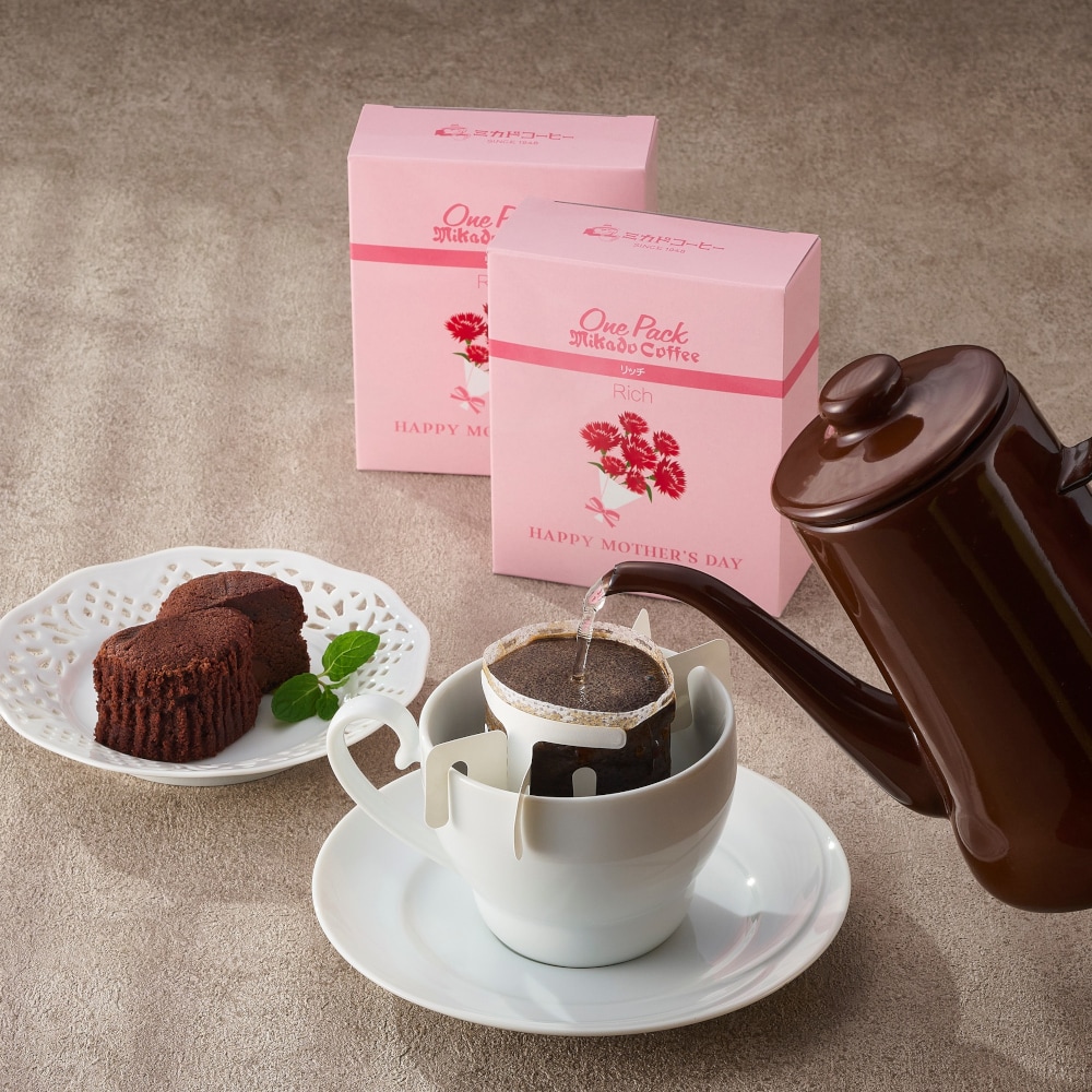 1948年、東京・日本橋創業のコーヒーロースター『ミカド珈琲』がお届けする、奥行きのある香りに、深みのあるコクと苦味のリッチな味わいのドリップコーヒーと、濃厚な味わいのチョコレート焼菓子のセットです。母の日特別パッケージでお届けいたします。