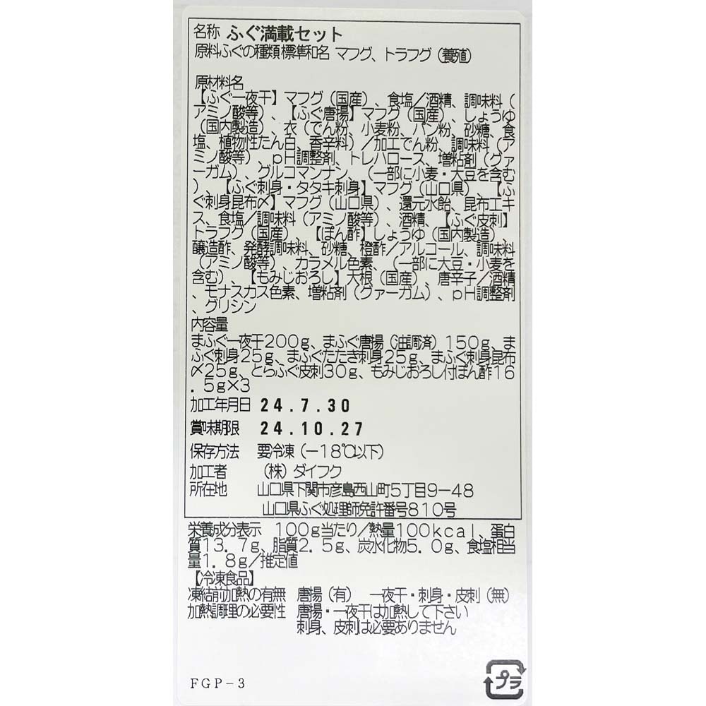 ●まふぐ刺身25g×1皿、まふぐたたき刺身25g×1皿、まふぐ刺身昆布〆25g×1皿、まふぐ唐揚150g(油調済)、まふぐ一夜干200g、とらふぐ皮刺30g、もみじおろし付ぽん酢16.5g×3袋
