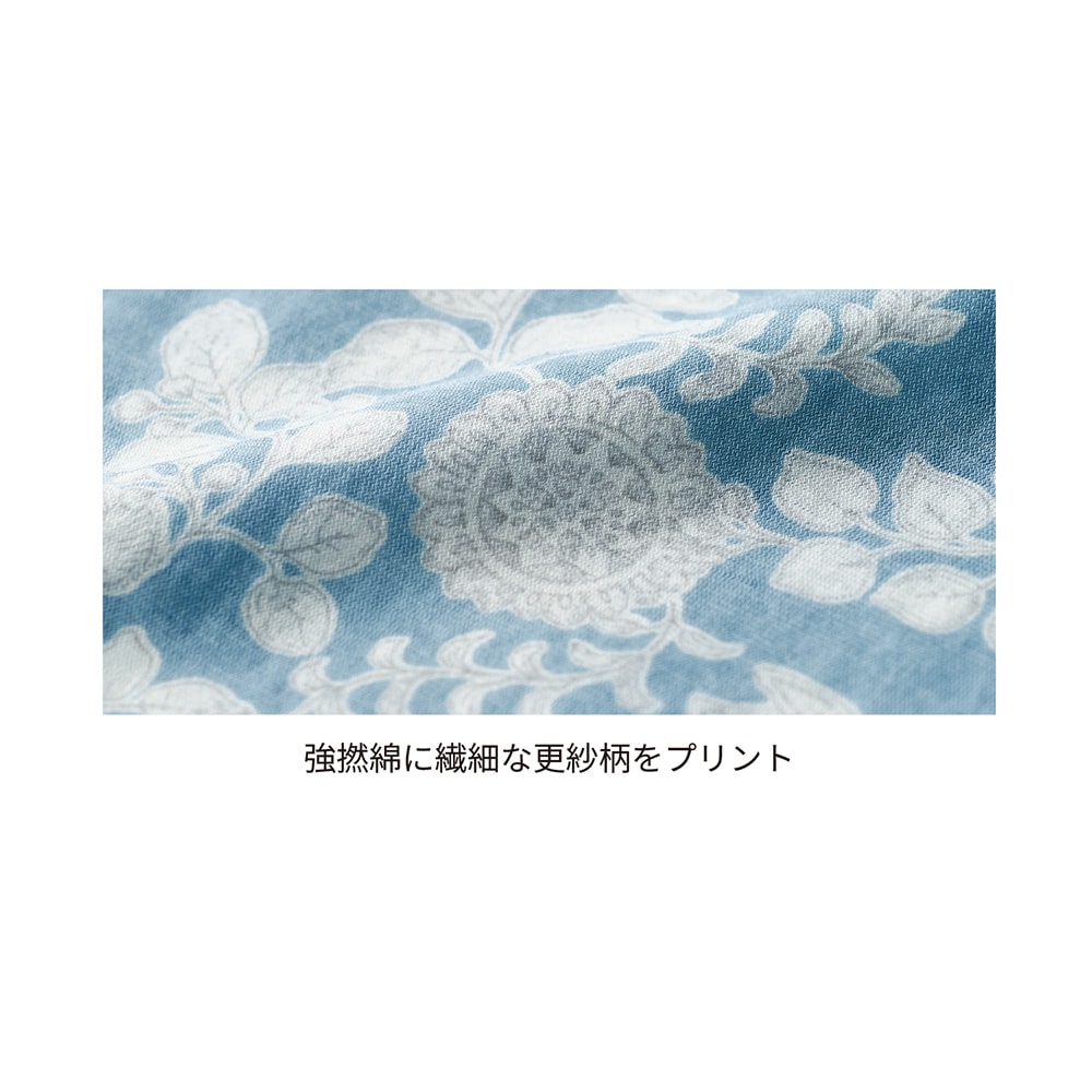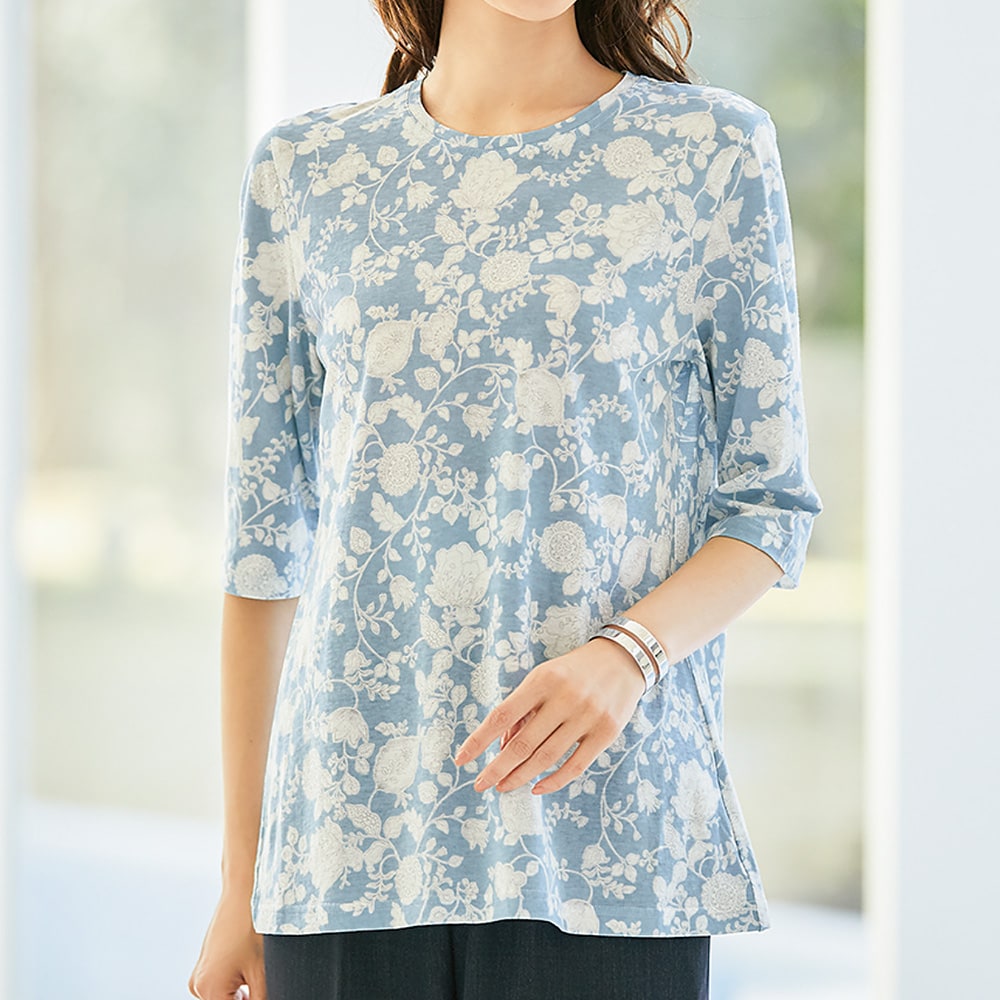 汗ばむ季節も肌にまとわりつきにくい強撚綿を使用。単色のプリント柄で派手になりすぎず、一枚で品よく着こなせます。5分袖、チュニック丈などボディカバー力も満点。