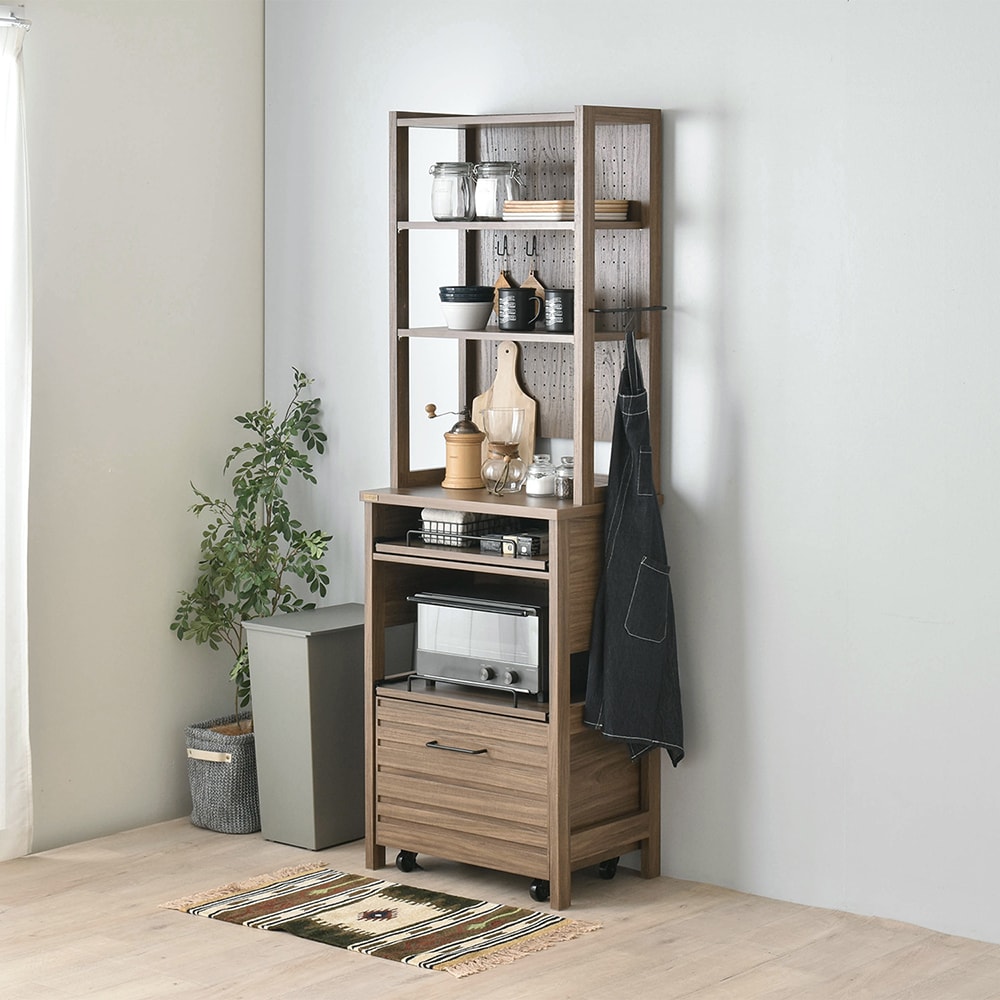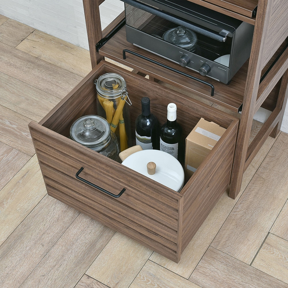 収めたかった家電(レンジ・ポット・トースター)全て収めることができ、一番下の収納も米びつに、ペットボトルまで片付けることができました。大満足です!