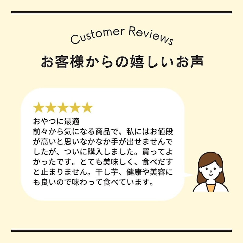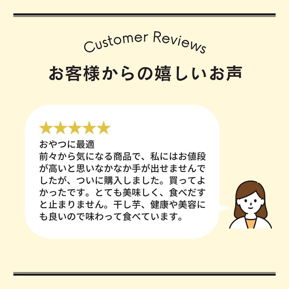 前々から気になる商品で、私にはお値段が高いと思いなかなか手が出せませんでしたが、ついに購入しました。買ってよかったです。とても美味しく、食べだすと止まりません。干し芋、健康や美容にも良いので味わって食べています。