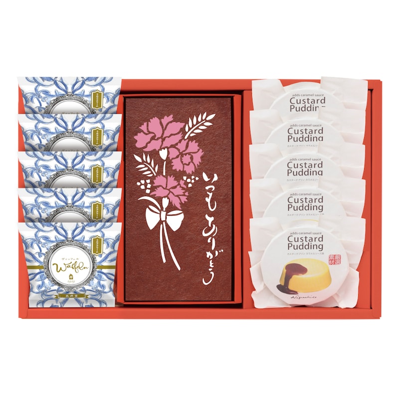 お母さんへ感謝の気持ちを届けるメッセージ入りの「カステーラ」に、「プリン」「ヴァッフェル」を詰合せしました。