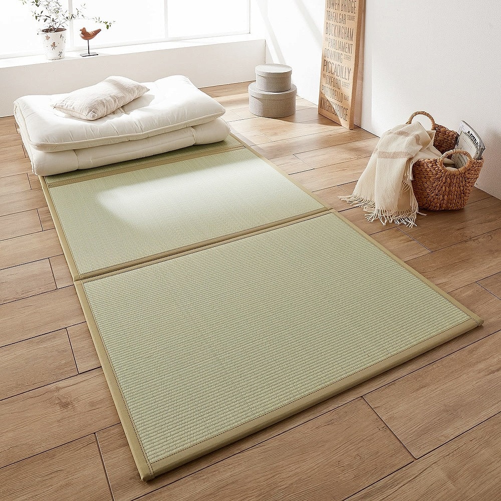 画像がありませんが裏面は不織布になっています。やや厚めでふにゃふにゃすることなく敷けます。表面はカビの抑制に良いヒバ加工が施されたい草です。縁取りがきちんとしているので品質はバッチリ!欲を言えば収納ケース付きだと良かったかな?お値段が他のものと比較すると高めに感じますから。