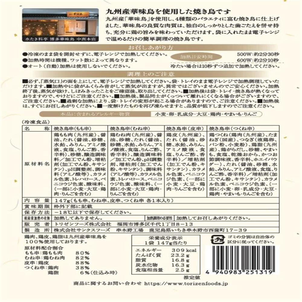 九州産銘柄鶏「華味鳥」を使用し、4種類のバラエィー溢れる焼き鳥に仕上げました。華味鳥の良質な肉質は、独自のしっかりした歯ごたえを併せ持ち、更に鶏独特の臭みを抑えている為、充分に鶏の旨みを味わっていただけます。華味鳥の様々な部位が奏でる素材の味をご賞味ください。袋に入れたままレンジで温めるだけの簡単調理の焼き鳥です。