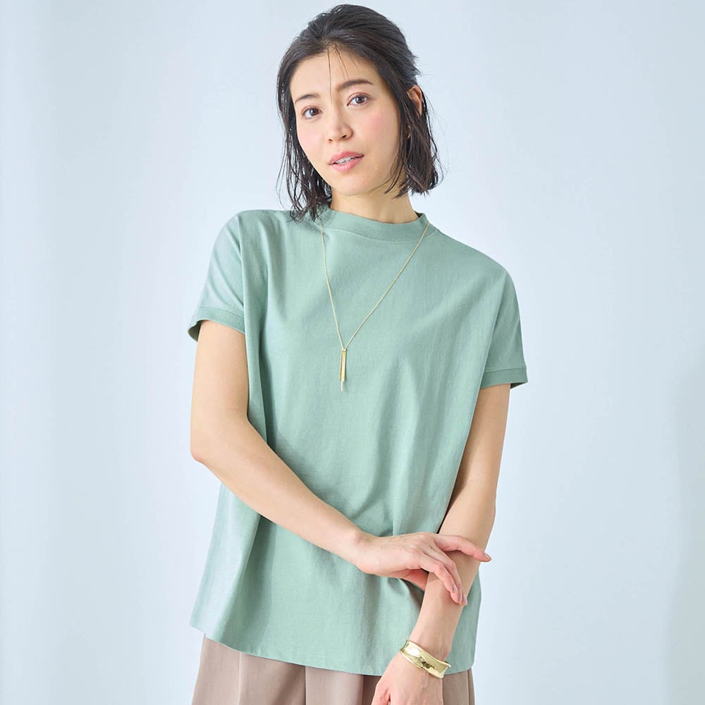 暑苦しくないハイネックで、袖の切り替え無しで半袖というデザインが良いです。フィットし過ぎず、厚みもあるしっかりした素材です。はつらつとしたアクアブルーで、元気が出そうです。