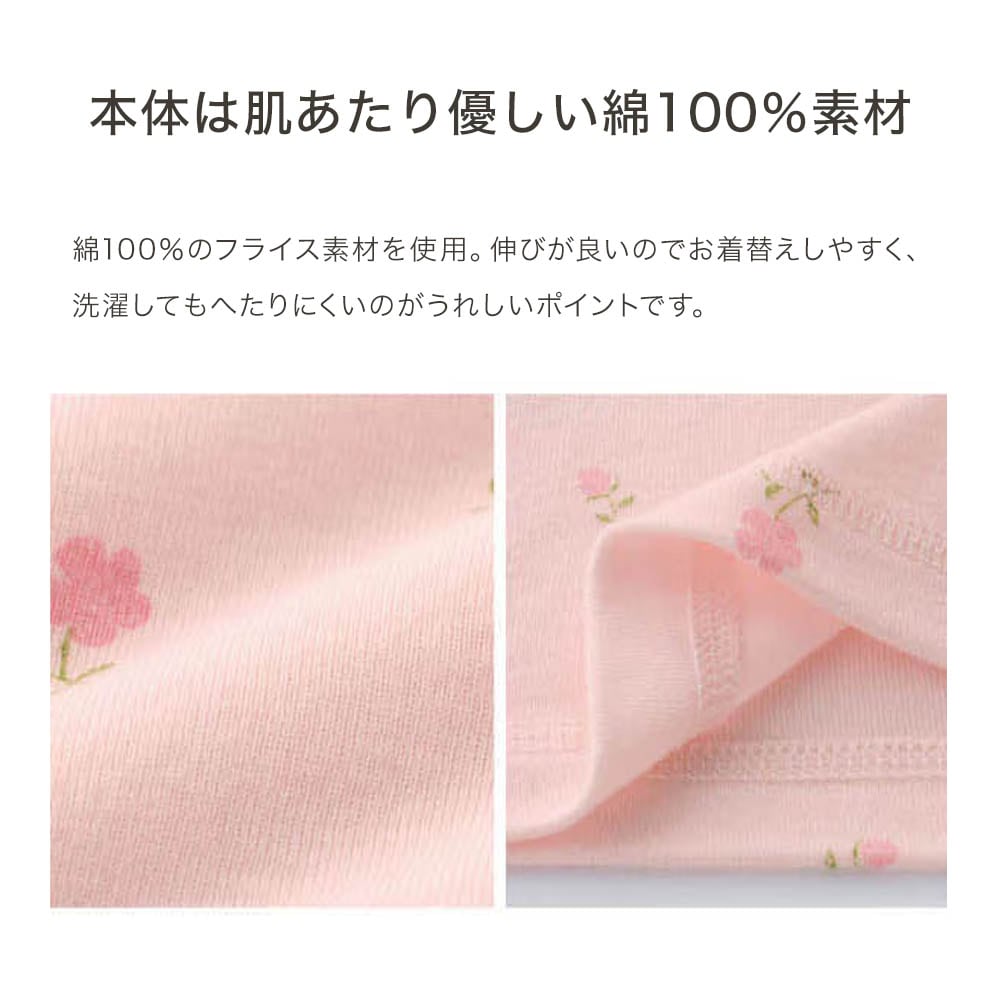 レース、リボン、淡い色味、お花、ハート、音符…子どもの大好きな要素いっぱいのデザインで喜んで着用しています。綿で生地が柔らかく、着心地が良さそうです。