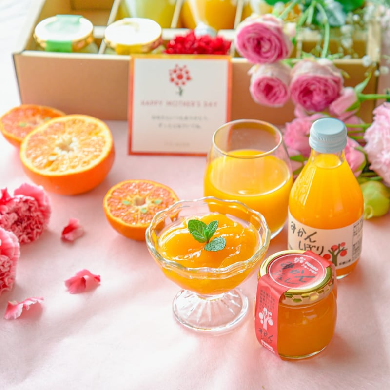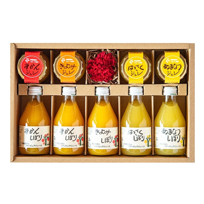 ●100%ピュアジュース(みかん180ml×2本、きよみ・はっさく・あまなつ:各180ml×1本)、ピュアフルーツ寒天ジュレ(みかん・きよみ・はっさく・あまなつ:各90g×1個)