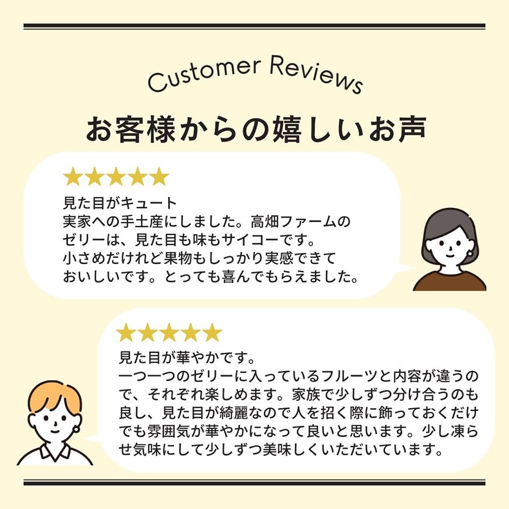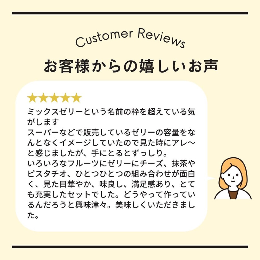 一つ一つのゼリーに入っているフルーツと内容が違うので、それぞれ楽しめます。家族で少しずつ分け合うのも良し、見た目が綺麗なので人を招く際に飾っておくだけでも雰囲気が華やかになって良いと思います。少し凍らせ気味にして少しずつ美味しくいただいています。