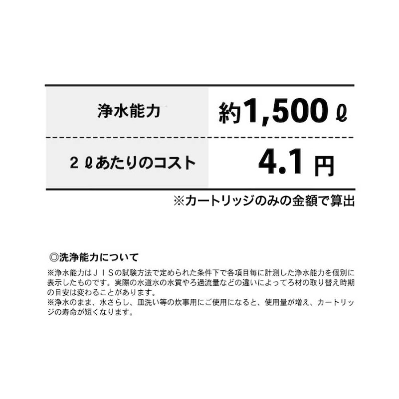 ※本商品の浄水能力はJISの試験方法で定められた条件下で各項目毎に計測した浄水能力を個別に表示したものです。実際の水道水の水質やろ過流量などの違いによってろ材の取替え時期の目安は変わることがあります。