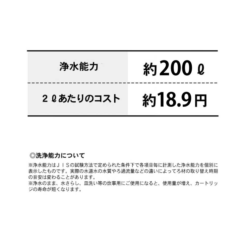 ※本商品の浄水能力はJISの試験方法で定められた条件下で各項目毎に計測した浄水能力を個別に表示したものです。実際の水道水の水質やろ過流量などの違いによってろ材の取替え時期の目安は変わることがあります。