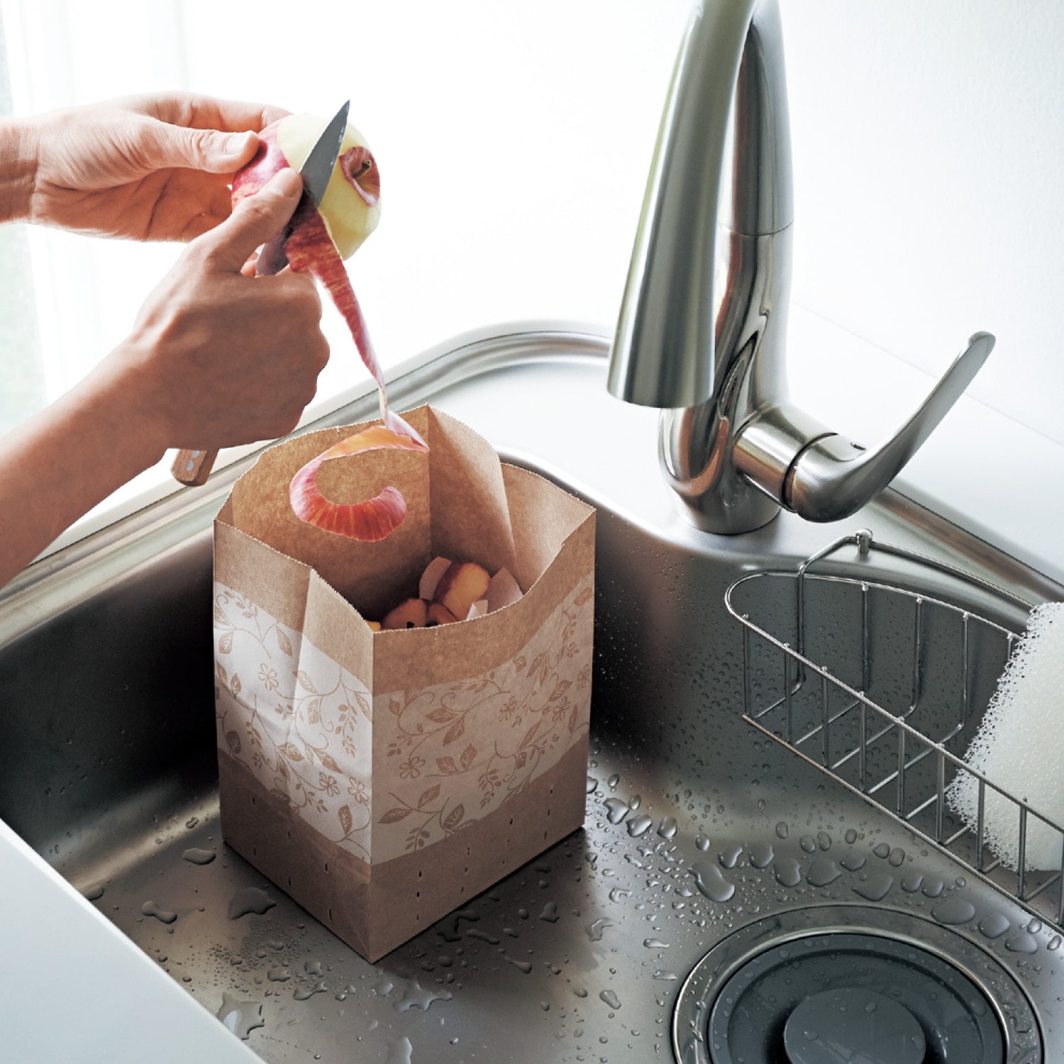 野菜のかわやクズ、卵の殻なんかを、ぱぱっと捨てられて便利です。冬はミカンの皮入れに活躍しました!シンク内に置いちゃうとさすがに水気がたまります。水抜きの穴はありますが、水気が流れ出るほど大きな穴じゃないし数もそんなに空いてないので、水気汁気のあるものはあまり捨てていません。